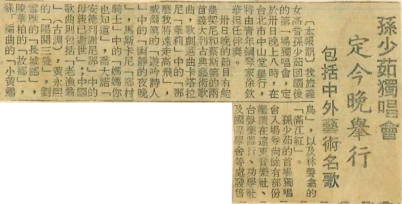 孫少茹獨唱 今晚間舉行 包括中外藝術名歌