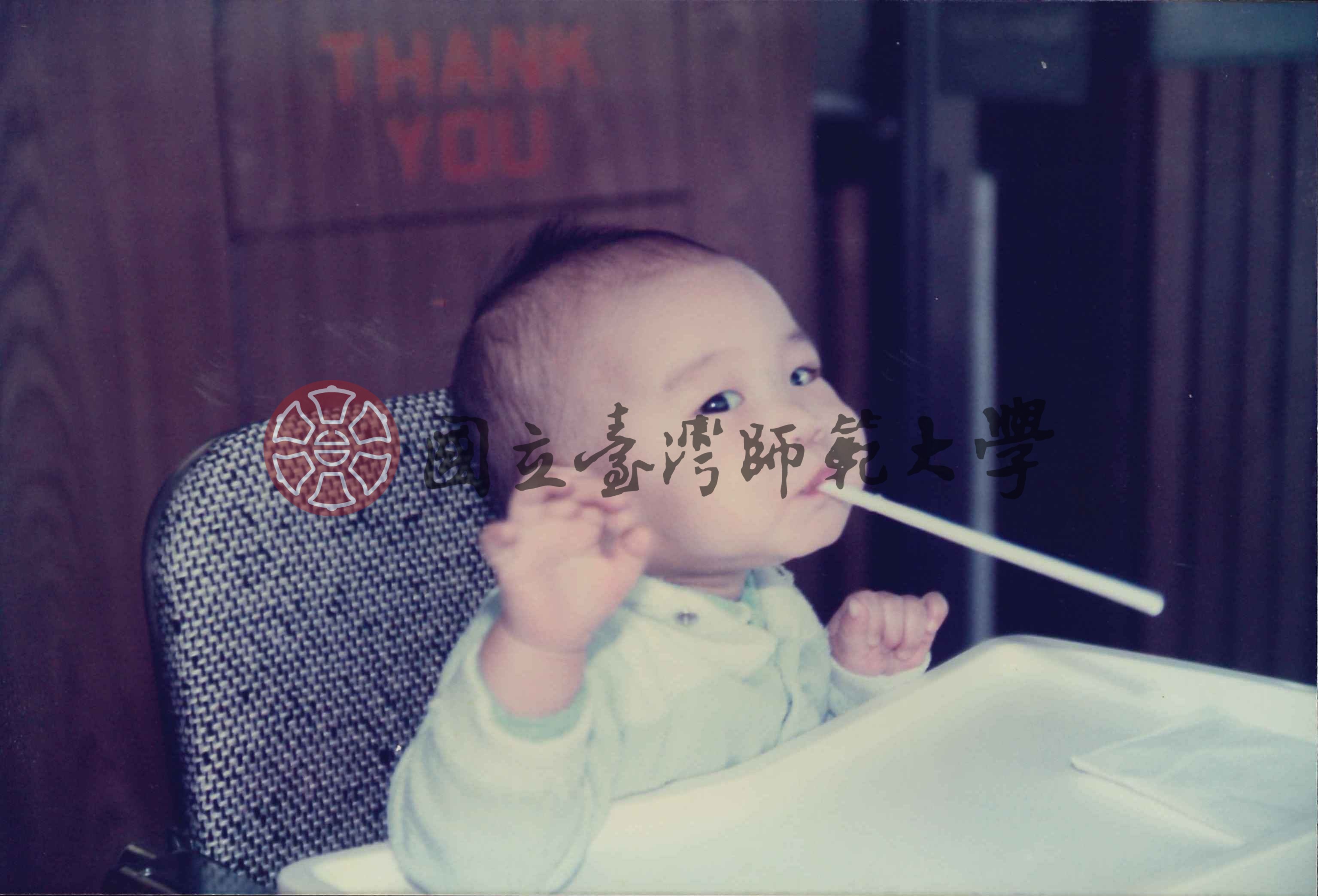 梁實秋家人照。背面標註「八個月大,○外頭吃漢堡包,喝汽水,津津有味。淘氣,喝完了汽水還叼著吸管不放。」