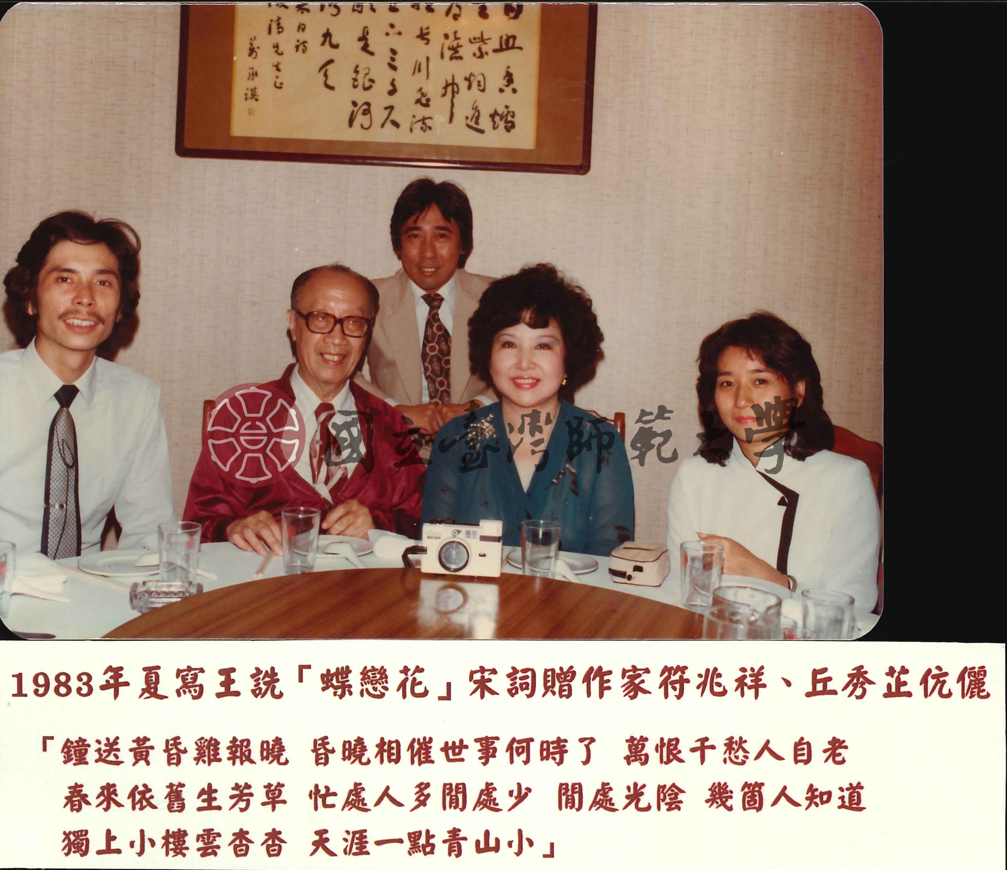照片旁標註:「1983年夏寫王○『蝶戀花』宋詞贈作家符兆祥、丘秀芷伉儷『鐘送黃昏雞報曉 昏曉相催世事何時了 萬恨千愁人自老 春來依舊生芳草 忙處人多閒處少 閒處光陰 幾箇人知道 獨上小樓雲杳杳 天涯一點青山小』」
