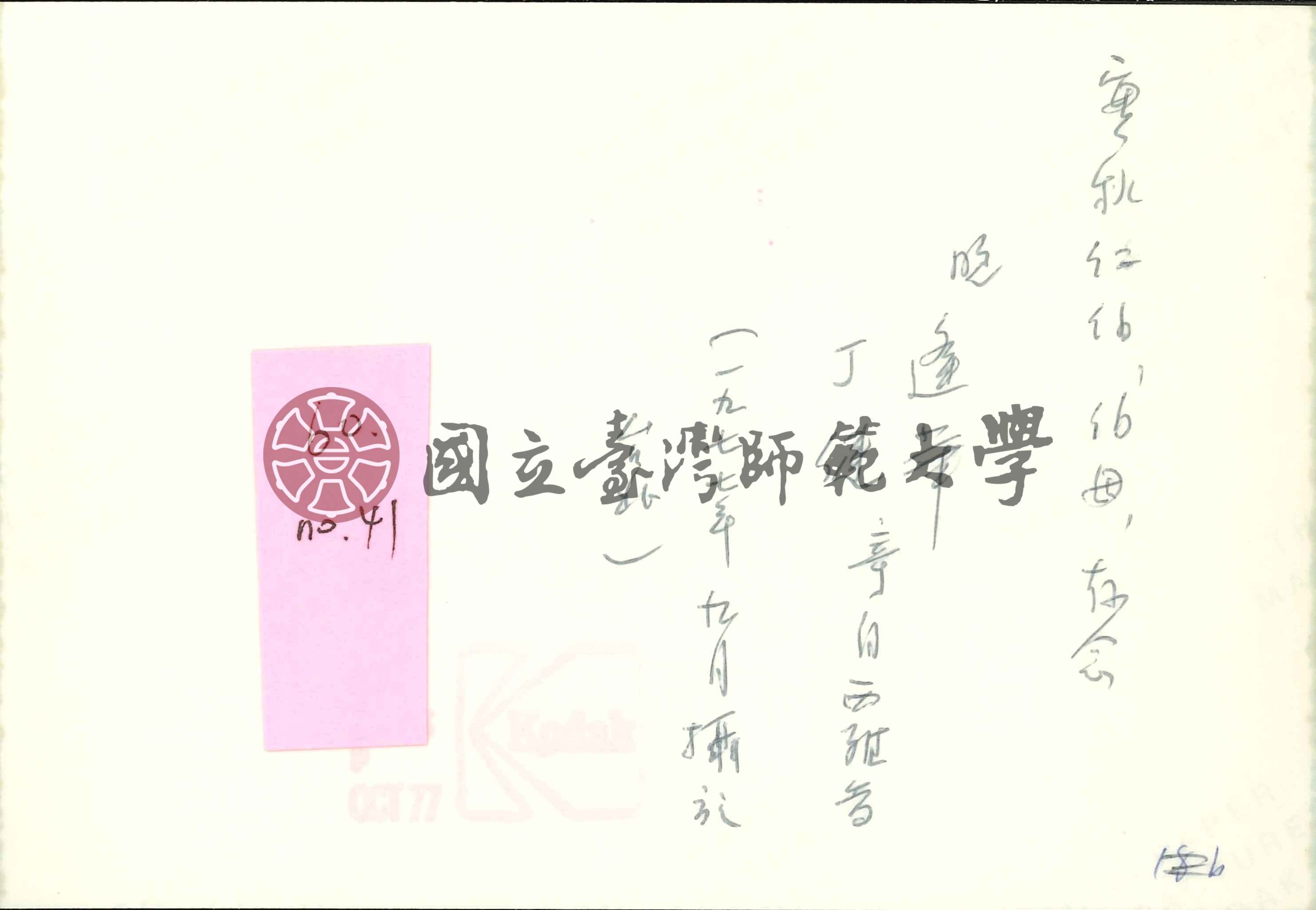 背面標註:「實秋仁柏、伯母存念:晚 逢華、丁健寄自西雅圖(一九七七年九月攝於台北)」