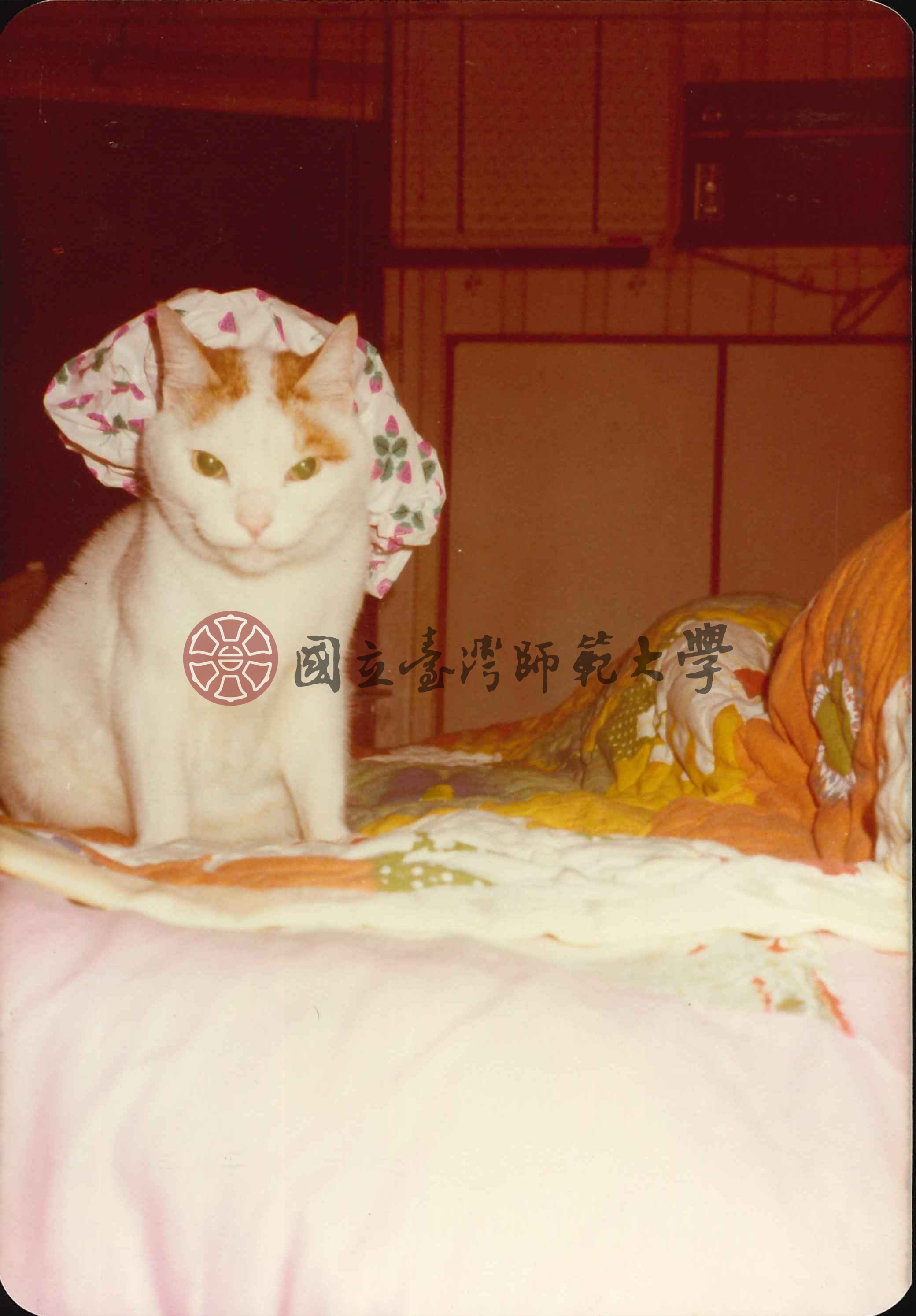 白貓王子坐在床上,頸後圍有裝飾小碎花圍巾