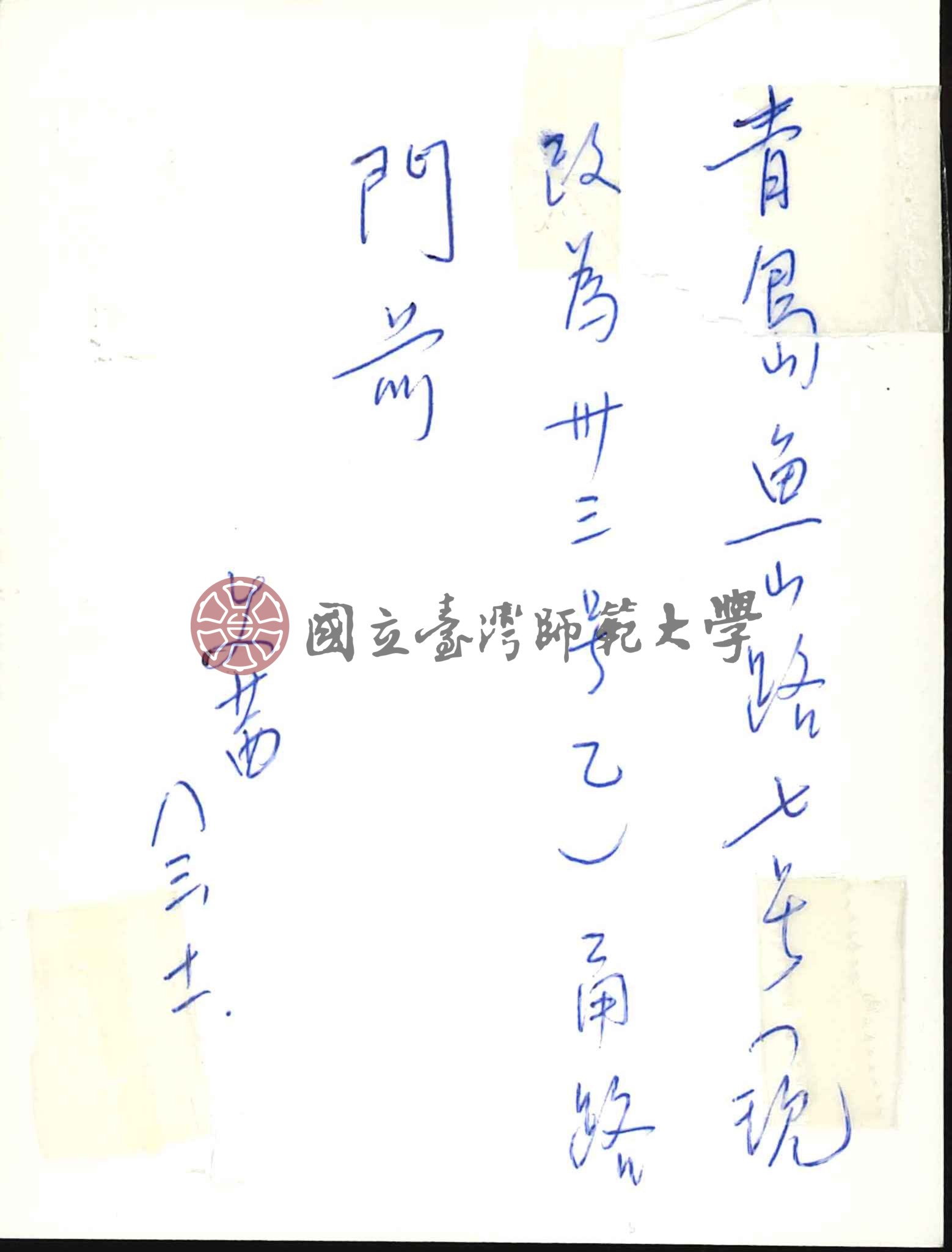 背面標註「青島魚山路七號舊居(現改為卅三號乙)。角路門前。 女 文茜 八三、十一」