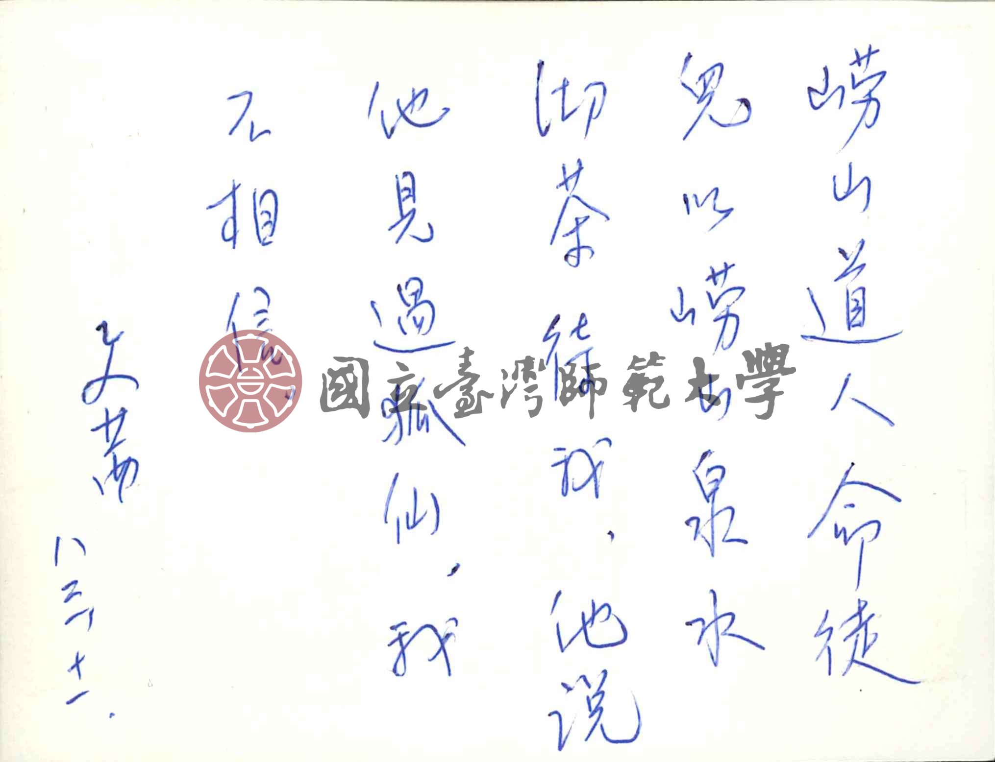 背面標註「嶗山道人命徒而已勞山泉水沏茶待我,他說見過狐仙,我不相信。 文茜 八三、十一」