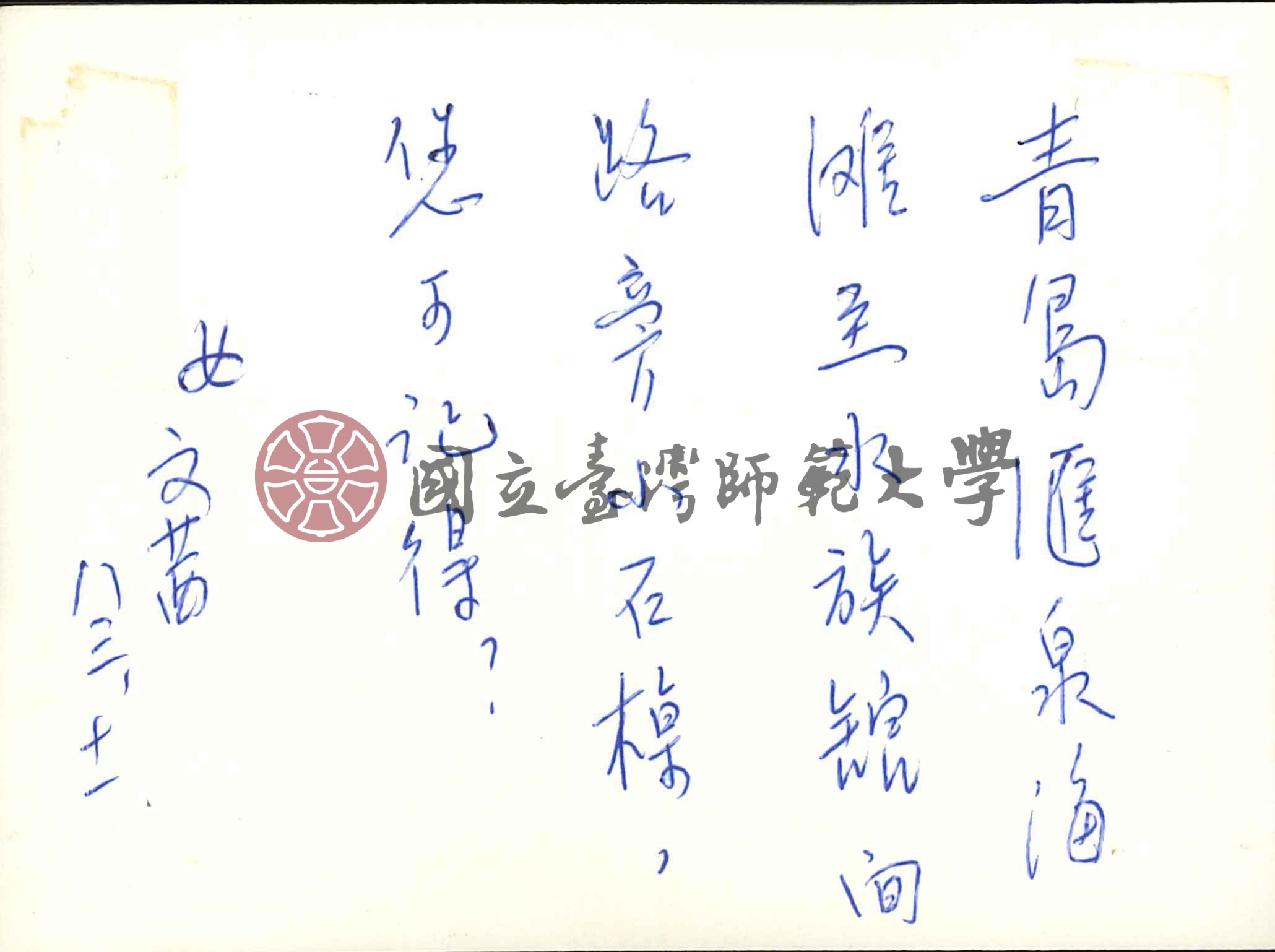 背面標註「青島匯泉海灘至水族館間路旁小石槕,您可記得? 女 文茜 八三、十一」