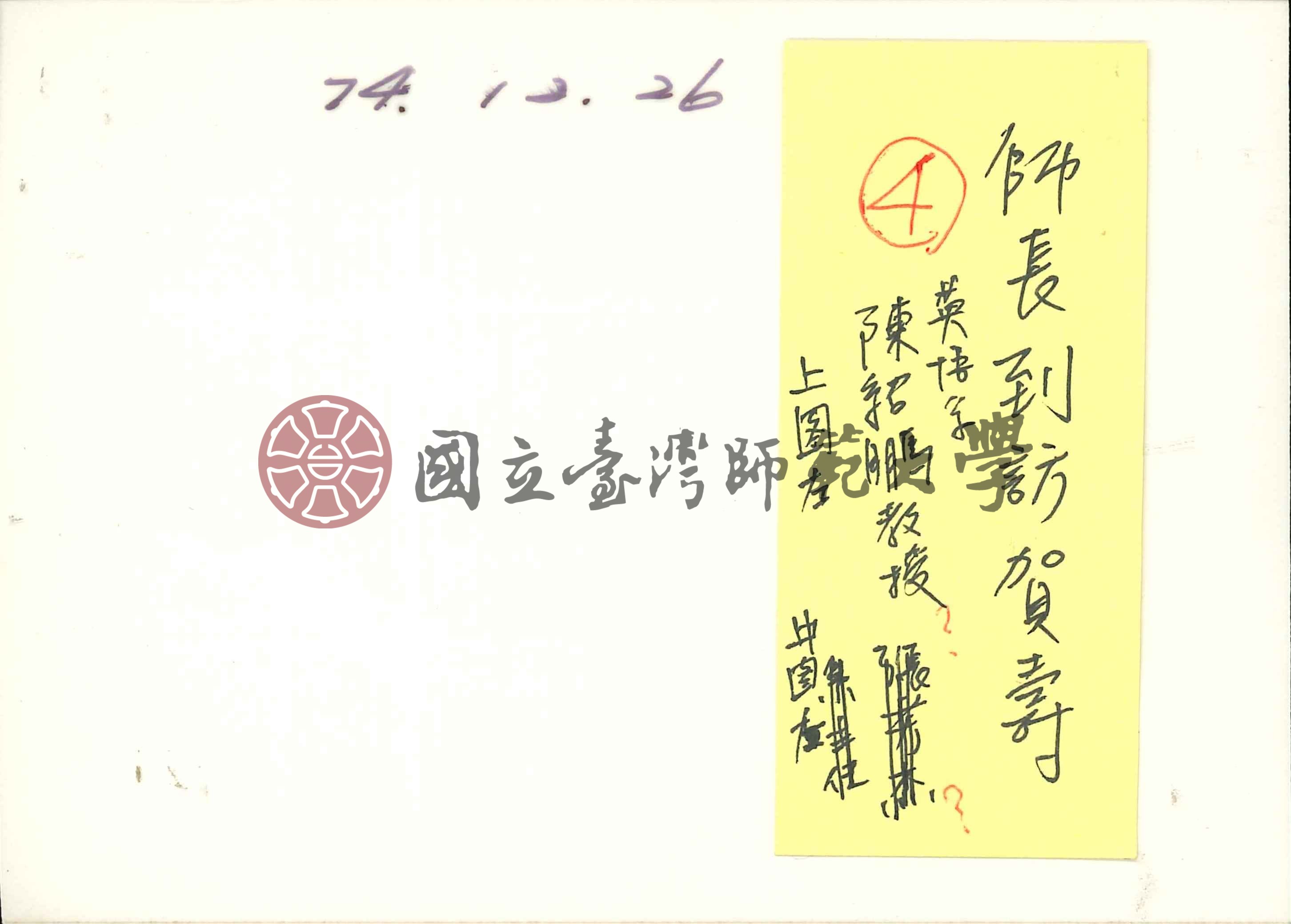 陳紹鵬先生前來祝壽。背面標註「74.12.26」、另外標註「師長到訪賀壽 英語系陳紹鵬教授 上圖左」